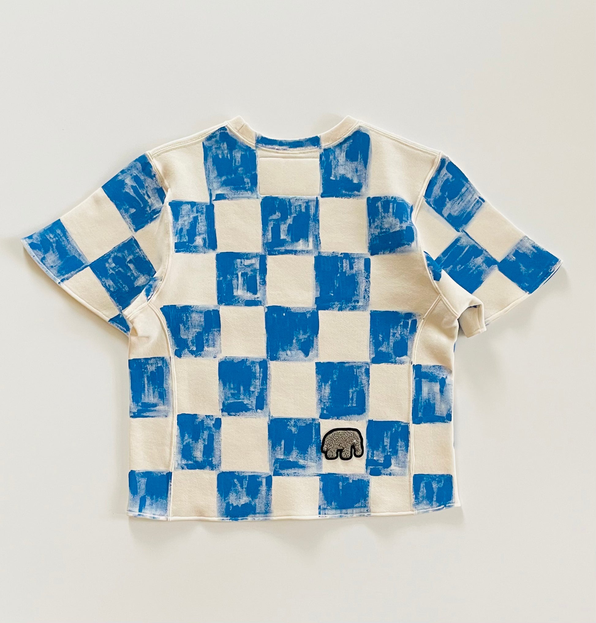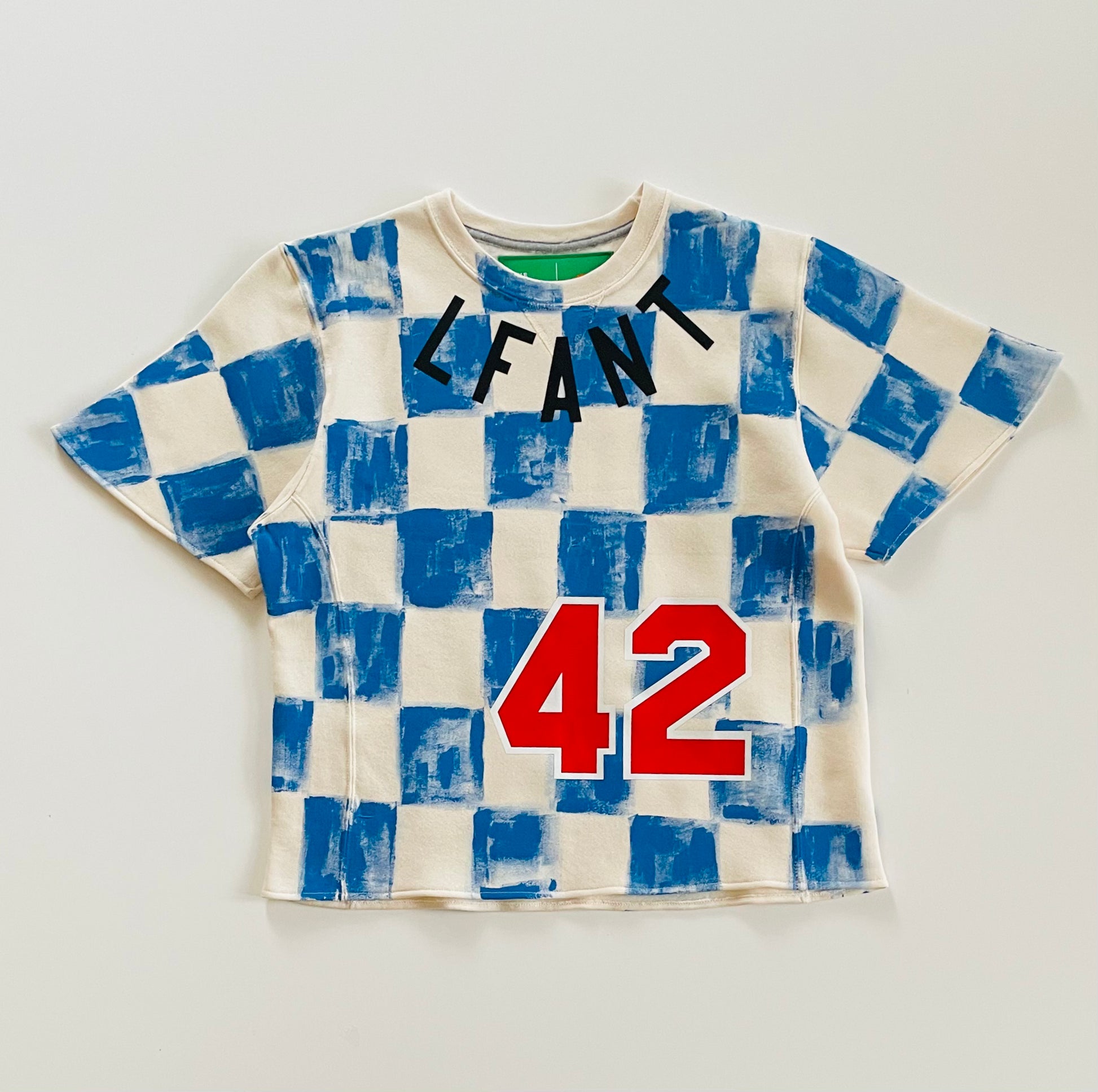Altered sweater for an authentic 1950's shape. Angled sleeves, LFANT branding on neckline, 8inch #42 on lower left hem. Hand painted checkered pattern front & back. Chenille elephant patch at back neckline.